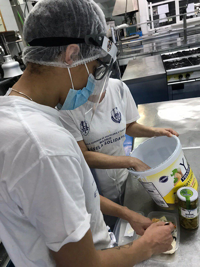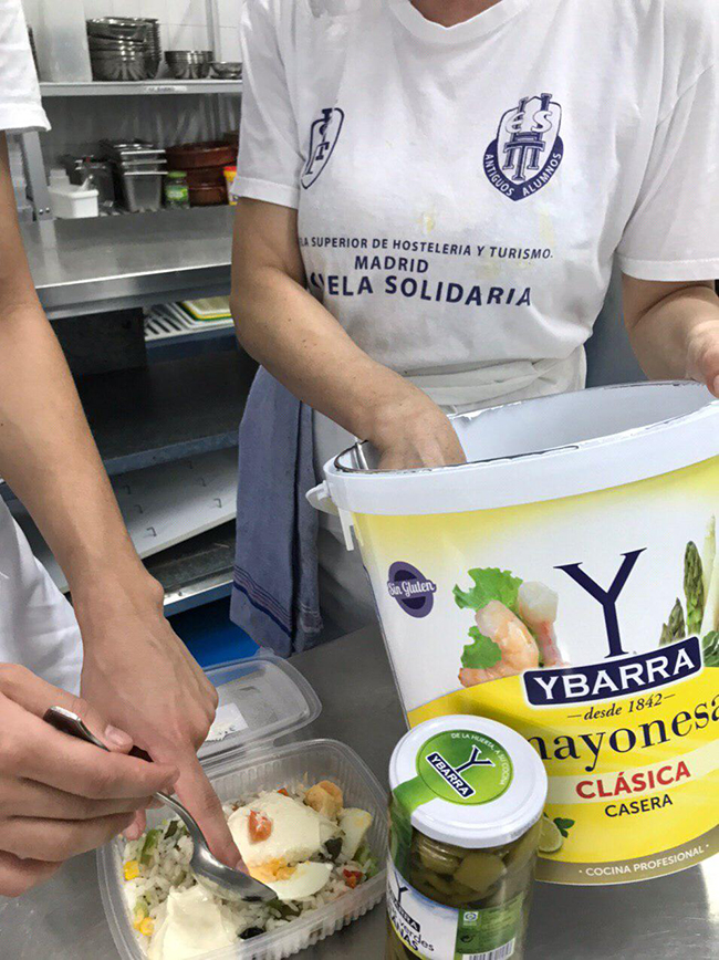 La Escuela de Hostelería y Turismo de Madrid ha recibido 65 cajas de productos de Grupo Ybarra (girasol, vinagre, mayonesa y judías verdes) para que voluntarios y cocineros puedan elaborar 1.000 comidas al día para paliar las necesidades de los más desfavorecidos por la Covid-19.